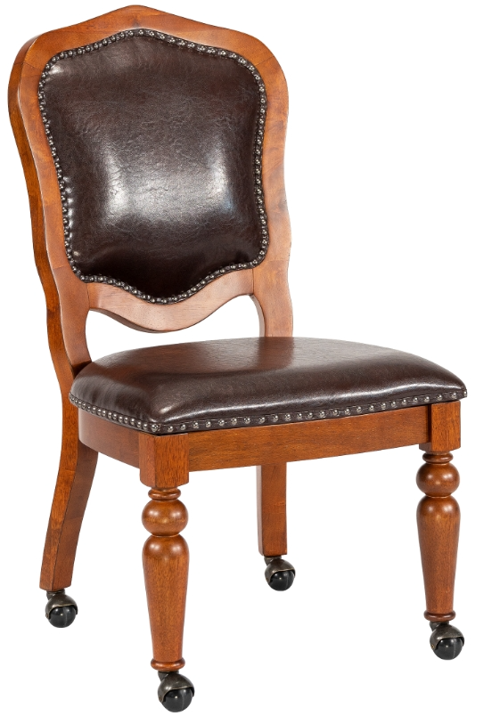 A pair of versatile, stylish Bellagio caster chair for your kitchen, dining room, office, or pub room. Finished in distressed brown cherry wood with espresso color seats. These regal upholstered chairs feature plush cushioned seats and seat backs with caster wheels for easy mobility.Read More