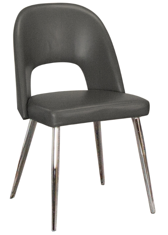 Sleek and versatile, this dining chair blends Scandinavian minimalism with mid-century charm. Angular chrome legs add Art Deco flair, while the dark gray faux leather upholstery offers lasting comfort and style. The cushioned open back is ergonomically designed for support, making it ideal for dining rooms, offices, vanities, and small spaces alike.Read More