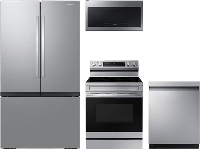 Samsung 4 Piece Fingerprint Resistant Stainless Steel Kitchen Package with French door refrigerator, top control built-in dishwasher, freestanding electric range, and over the range microwave.Read More