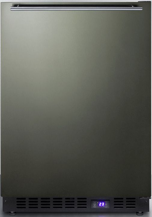 SUMMIT's SCFF53B Series brings quality and convenience under the counter with a fully featured lineup of built-in frost-free all-freezers. Sized with a convenient 24" footprint, the SCFF53BXKSHH freezer utilizes a front-breathing design for built-in installation under counters, with a fully finished black cabinet that also allows freestanding use. This model's reversible door comes in our new black stainless steel finish from our exclusive basalt collection. The wrapped door is made from 304 grade stainless steel with a high gloss finish in a neutral hue to perfectly accent or complement your kitchen design. The door is strongly resistant to most fingerprints and can easily be wiped clean with a dry cloth. Our signature thin handle in brushed stainless steel is mounted horizontally to complete the modern look. Inside, the SCFF53BXKSHH utilizes frost-free operation with fan-forced cooling to ensure low maintenance and even temperature distribution. Recessed LED lighting offers an attractive yet efficient look. The digital thermostat makes it easy to manage the interior temperature. This unit includes adjustable chrome shelves for flexible storage. Additional features include an open door alarm, high temperature alarm, and Sabbath mode setting that lets you disable some of the electrical elements during periods of observance. The SCFF53BXKSHH freezer is ETL-S listed to NSF-7 commercial standards. With its deluxe style and user-friendly features, this unit is the perfect choice for home or commercial kitchens. For a matching frost-free all-refrigerator, see the FF64BXSHH.